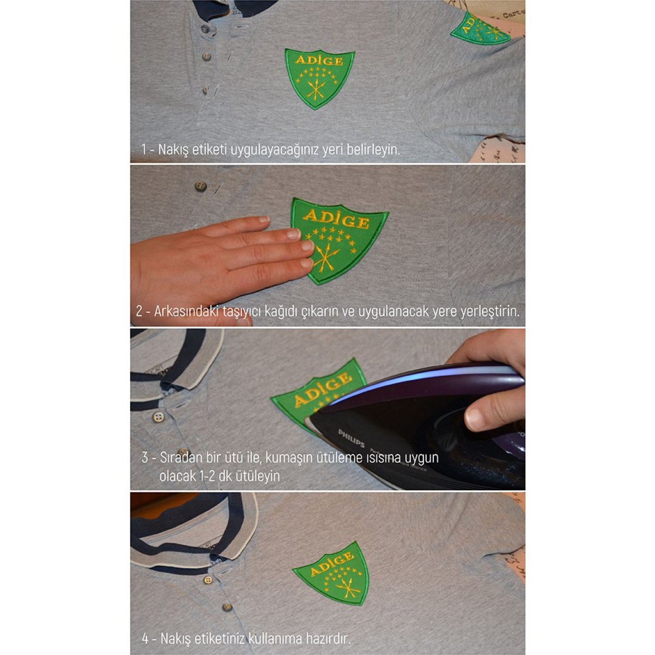 Ürünün arkasında yer alan yapıştırıcı ısı (Ütü) ile uygulanır.