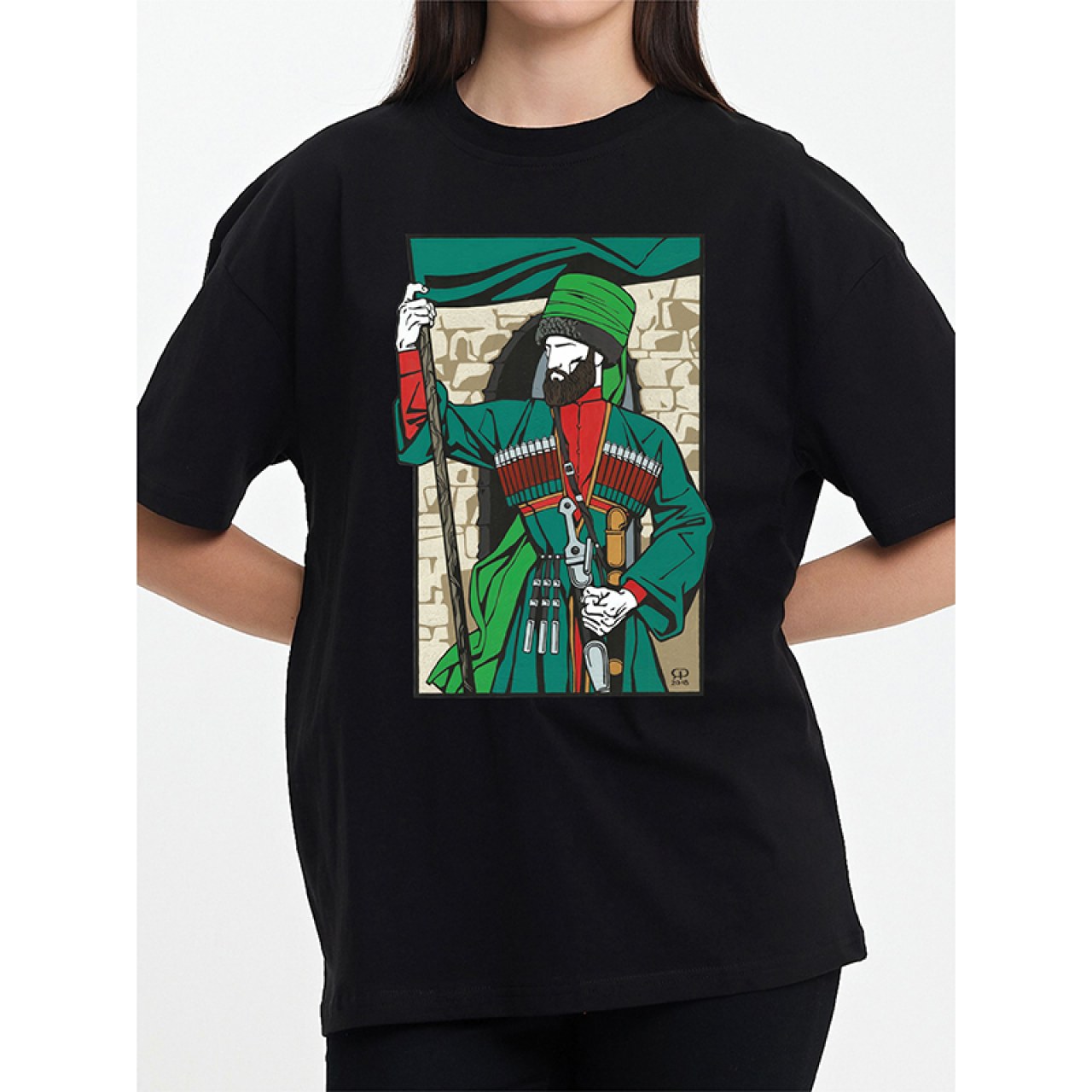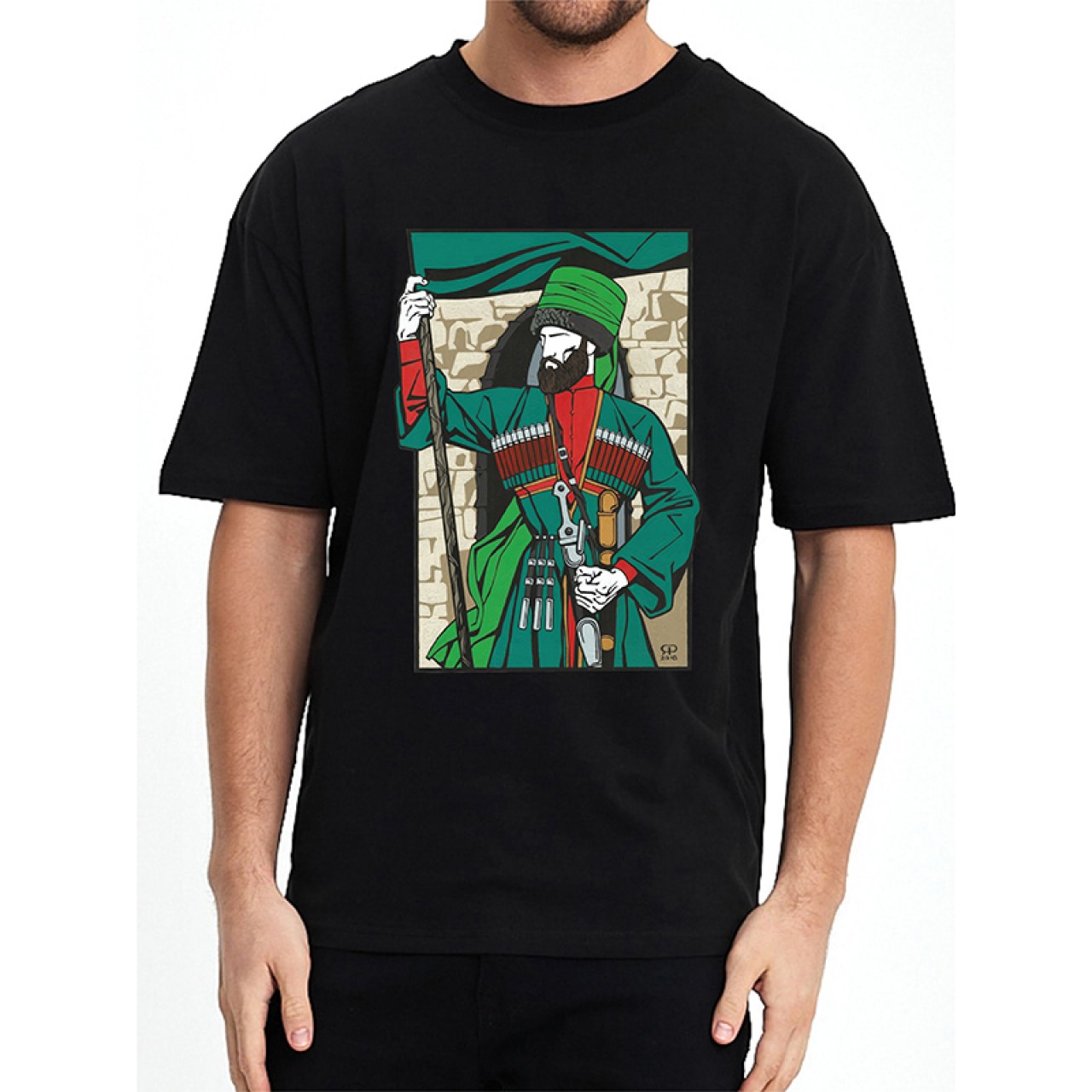 Bu özel koleksiyon ürünü, Kafkas kültürünün ve kahramanlık efsanelerinin ruhunu taşır. Çeçen ressam Rüstem Yahikhanov'un izniyle ve Kafkas Vakfı lisansıyla özel olarak tasarlanan "Şeyh Mansur" grafiği, benzersiz bir sanat eserini giyiminize taşıyor. Koleksiyonerler ve kültür sanat severler için ideal, anlamlı ve stil sahibi bir parça.