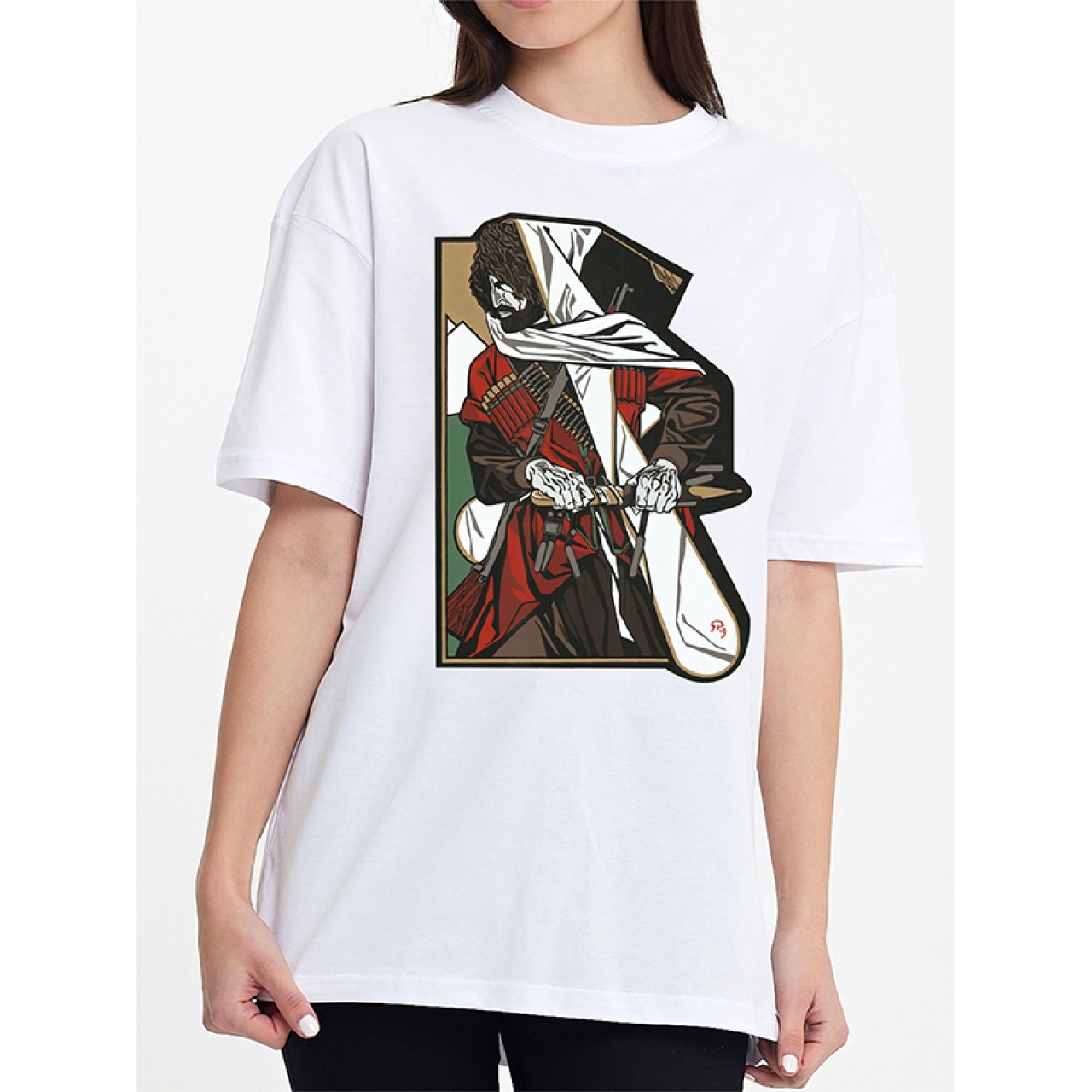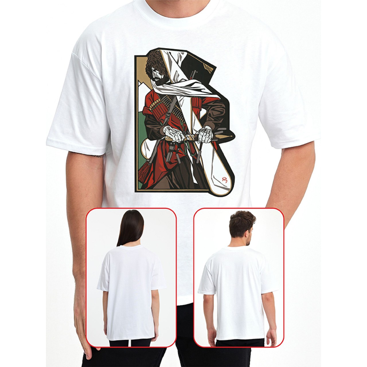 Особенный предмет коллекции, несущий в себе дух и мужество кавказской культуры! Эта белая футболка, представленная по оригинальной лицензии Фонда Кавказа, features уникальное произведение искусства, изображающее легендарного чеченского героя Абрека Заура. Яркий графический дизайн, созданный чеченским художником Рустемом Яхихановым, – это не просто одежда, а выражение культуры и истории. Изготовленная из материалов высшего качества, она гарантирует комфорт и долговечность.