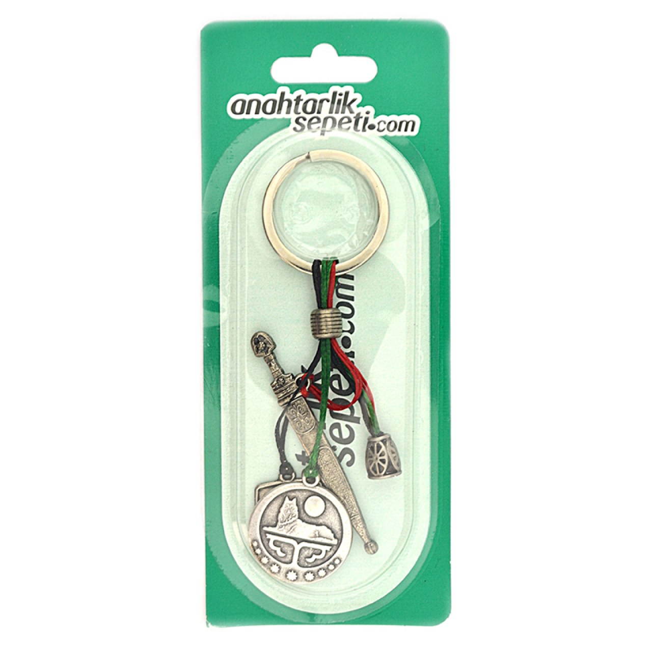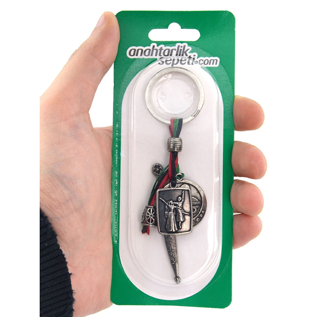 Bu şık ve dayanıklı anahtarlık, zamak metal malzemeden üretilmiş olup nikel-oksit kaplama ile yüksek kalite sunar. Üç farklı figürden oluşan salkım tasarımıyla dikkat çeker: Çeçen Bayrağı, Kafkas Kaması ve geleneksel oynayan çift figürü.